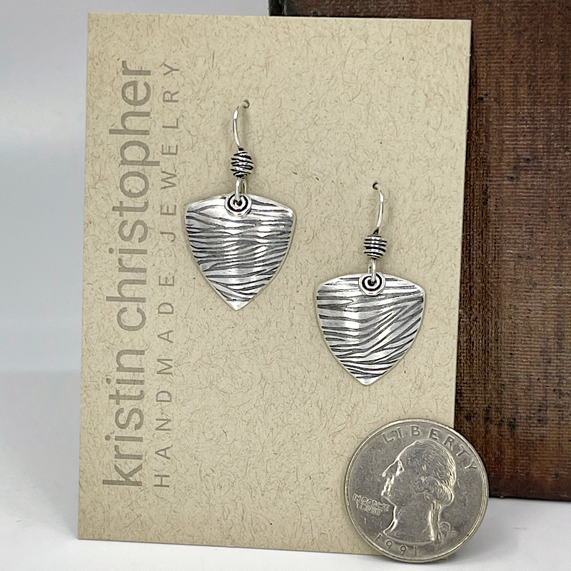 Silver triangle-shaped earrings on a 'Kristin Christopher' card with a quarter for scale.
