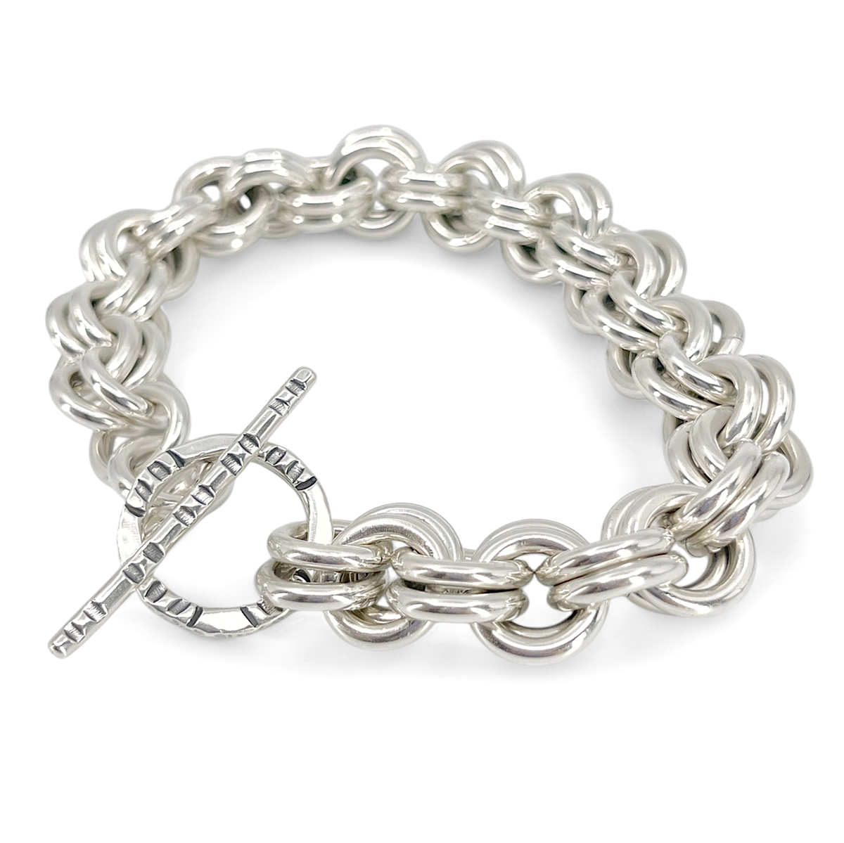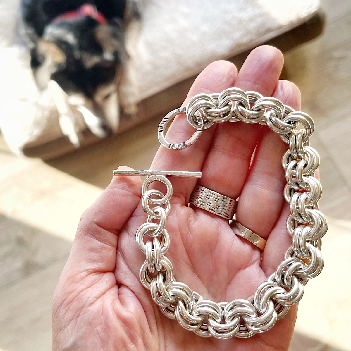 Handcrafted sterling silver chain bracelets, gemstone chain bracelets, chain mail bracelets, bangles, and cuffs with hand-stamped textural accents. Each piece is made by our hands with attention to detail and quality. We specialize in modern yet timeless designs to wear everyday — whether you’re dressing up your favorite t-shirt and jeans or adding a little extra personality for a night out. Order your sterling silver bracelet today for a unique, handcrafted addition to your jewelry collection.