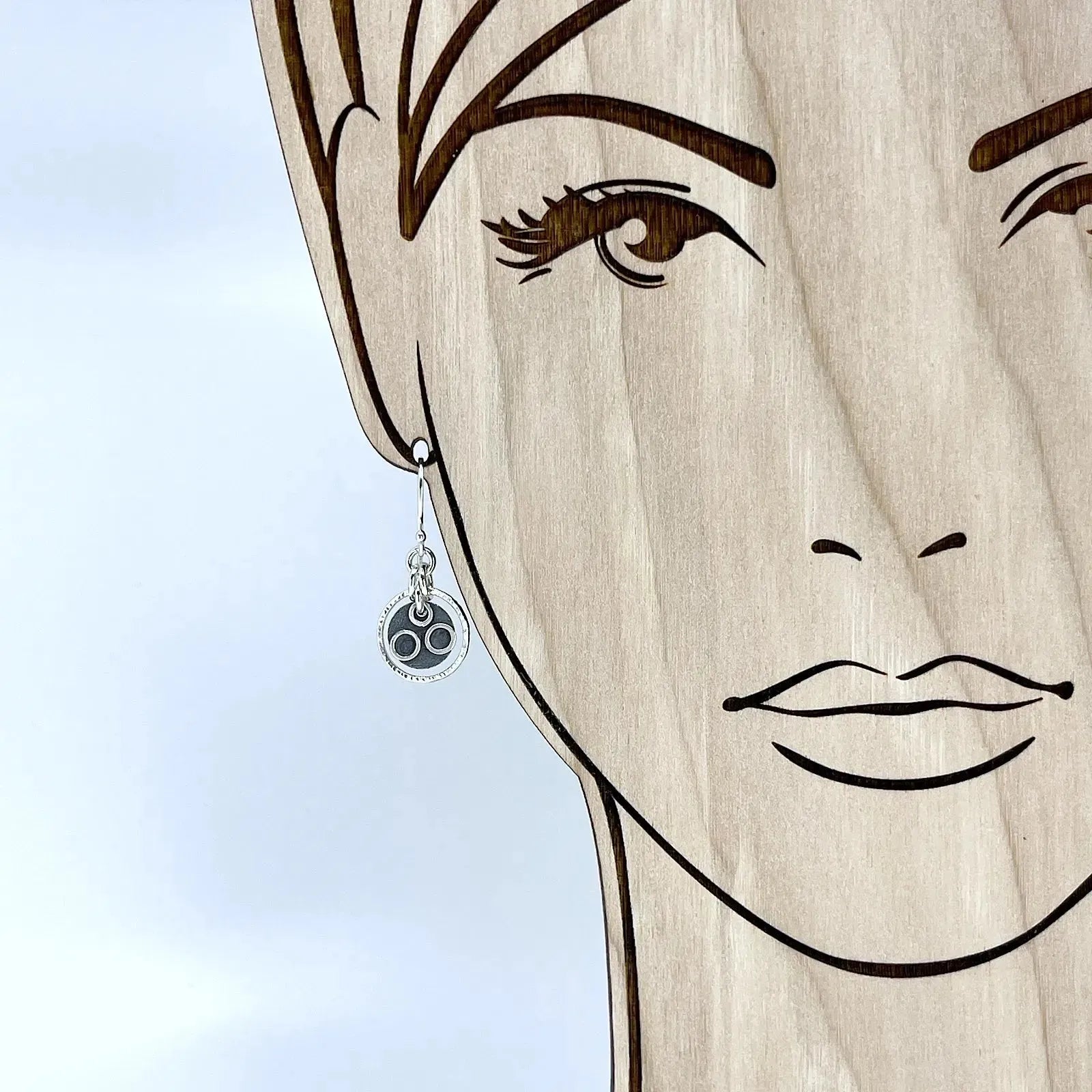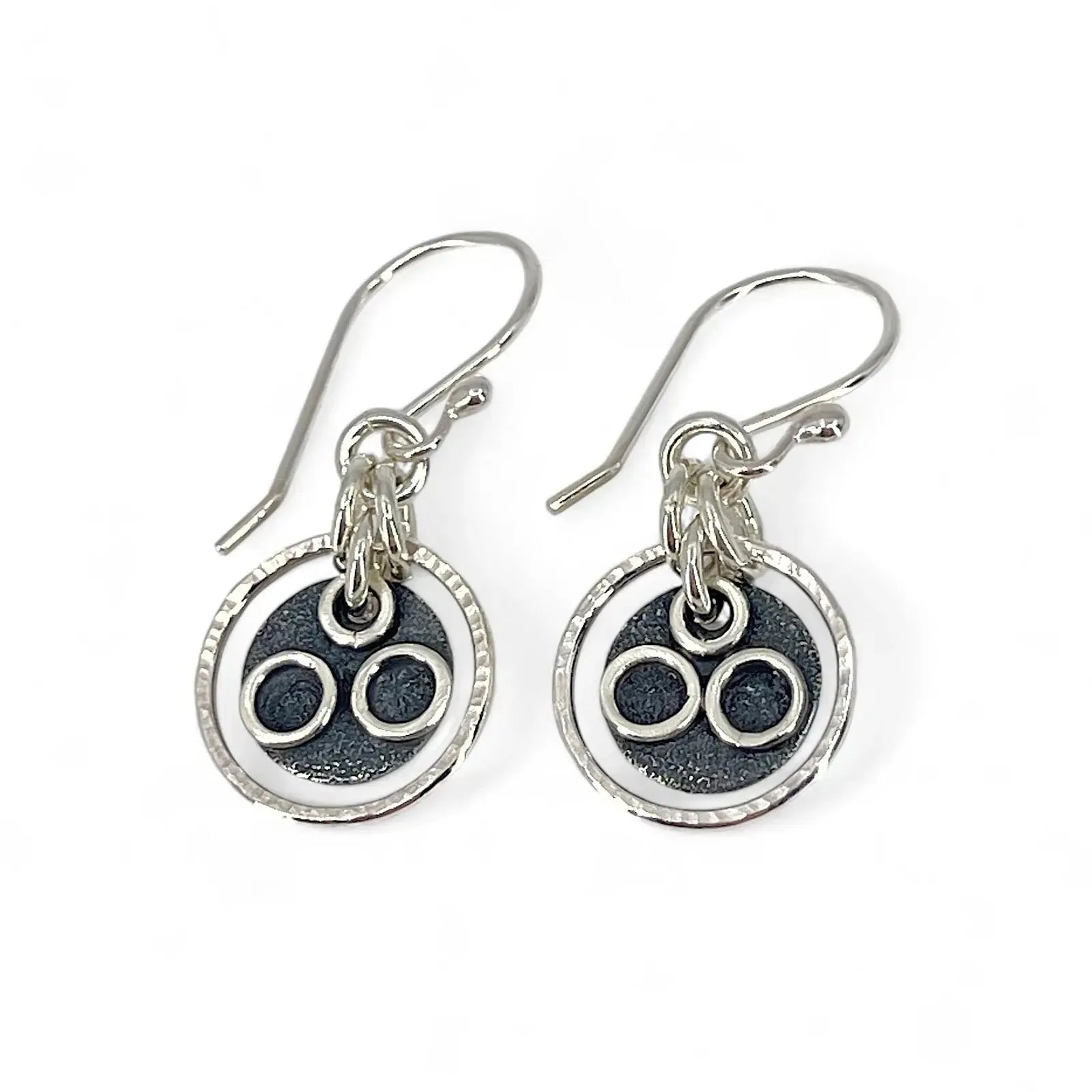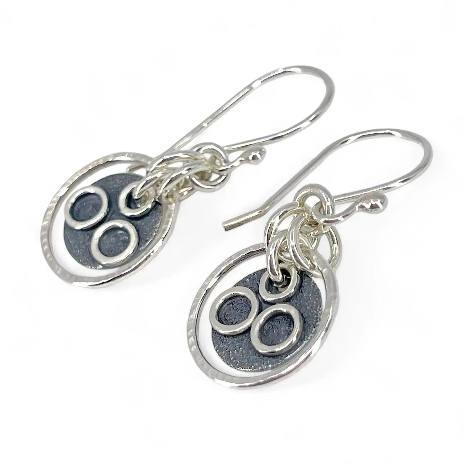 Add fun, style & individuality with art for your ears. Delicate geometric circles swing independently surrounded by hammered sterling hoops. All sterling — soldered, with a liver of sulfur patina.