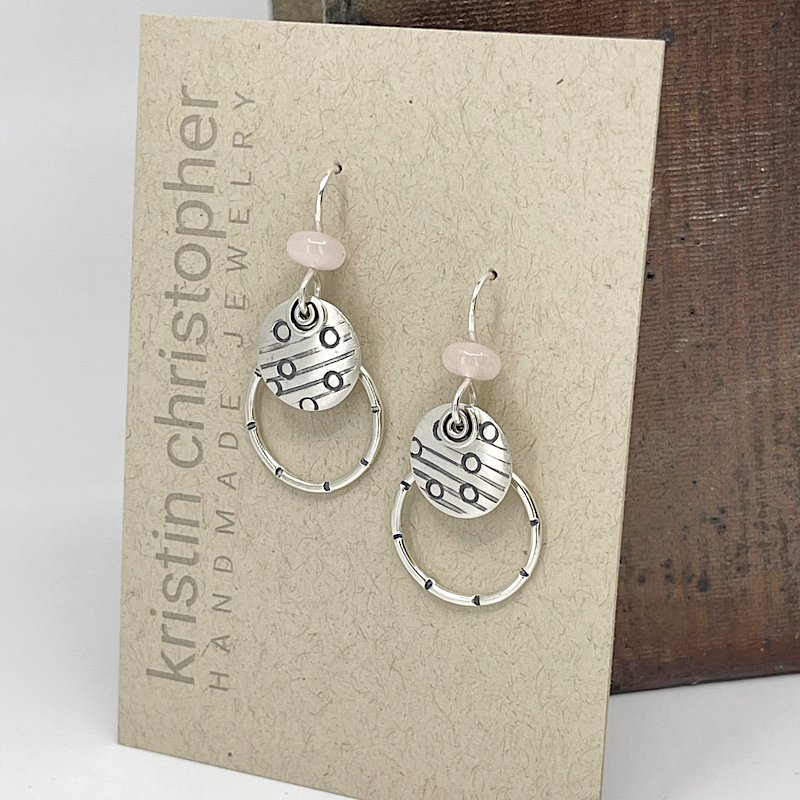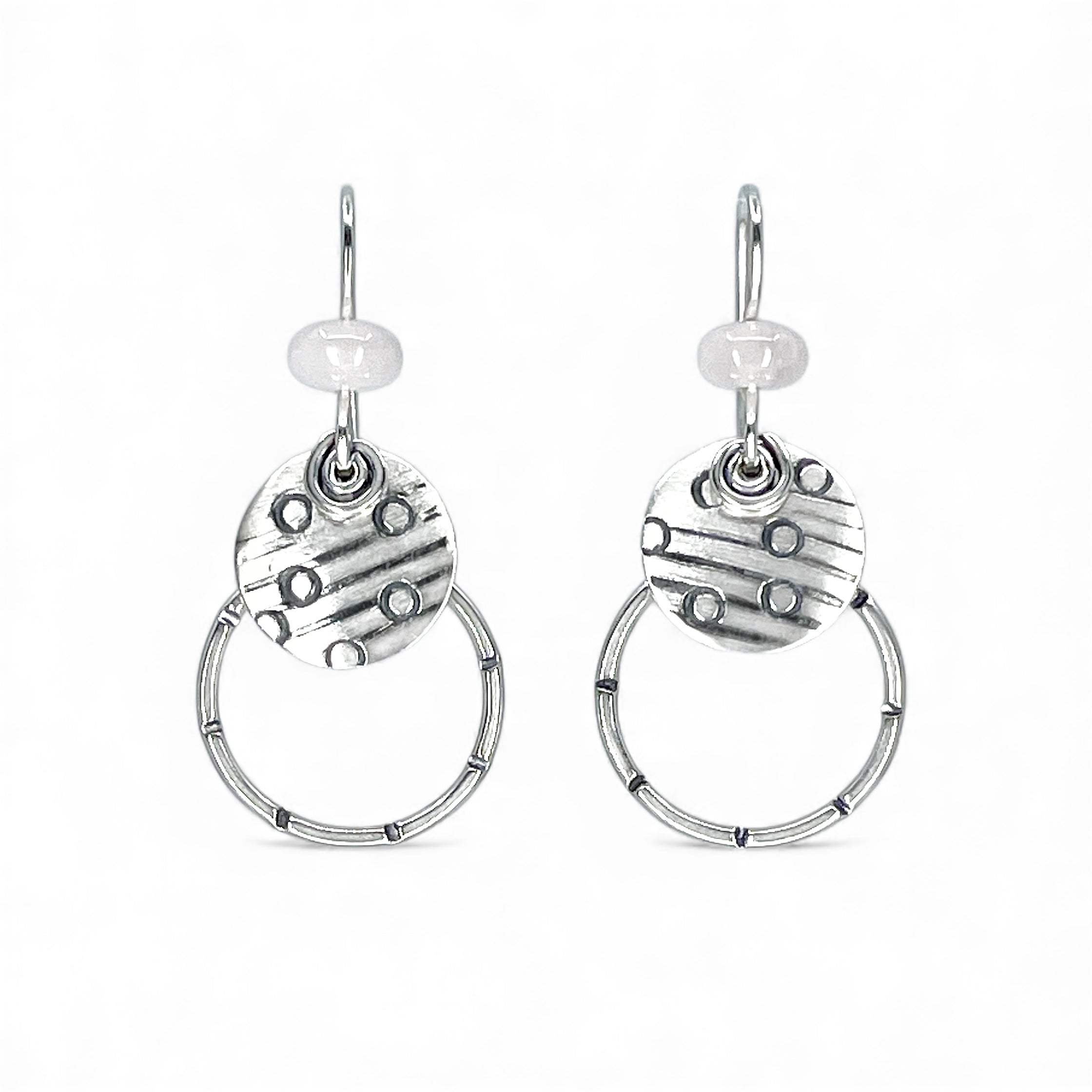 A fresh take on one of our most-loved designs — textured, elegant, and full of movement. These handcrafted sterling silver earrings feature roll-print and hand-stamped circles and hoops, finished with a subtle black patina that highlights every detail.