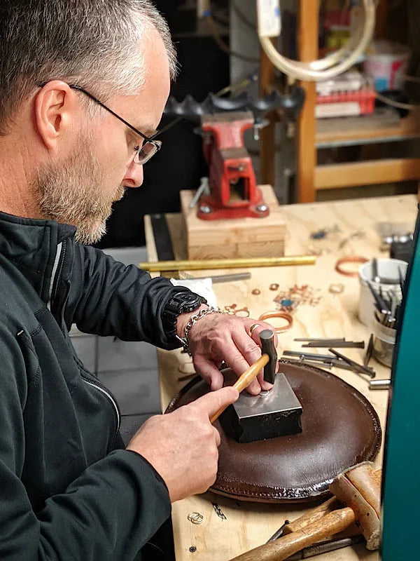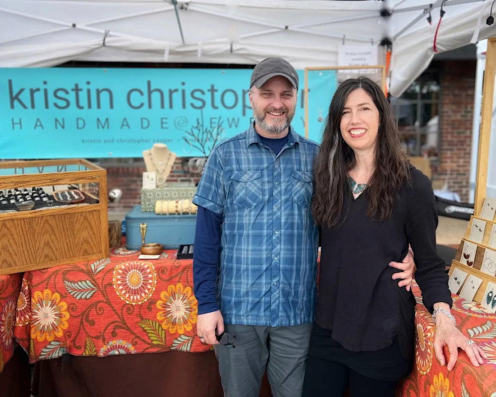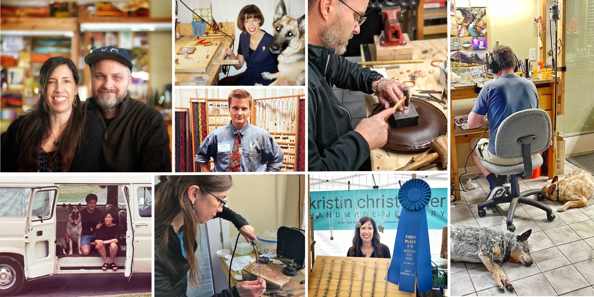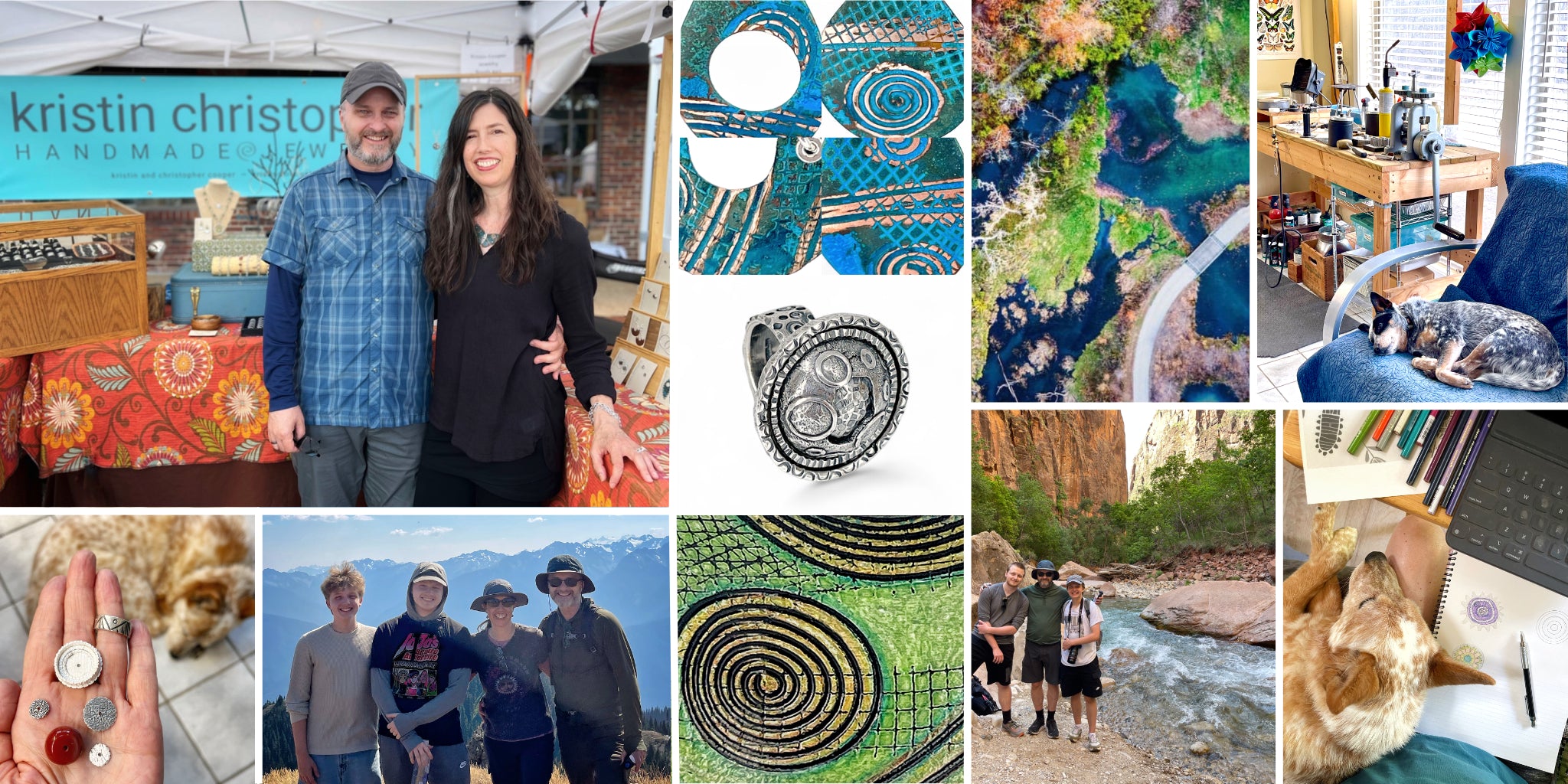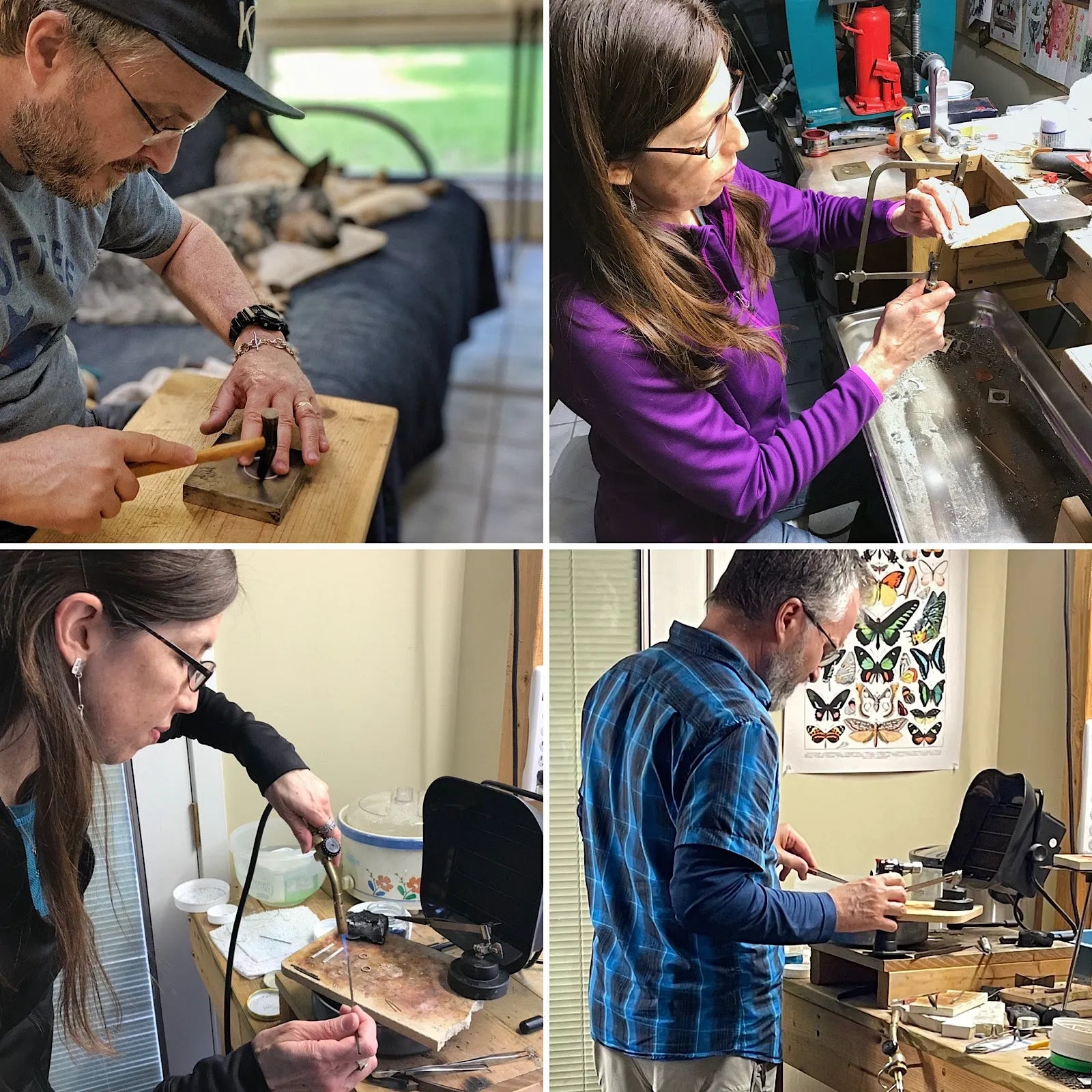 We’re Chris and Kristin Cooper — artists, metalsmiths, and long-time creative partners. We met over 30 years ago in a jewelry class at the University of Kansas, each earning BFAs in Metalsmithing and Jewelry Design. After years working in creative fields like writing, photography, animation, web and graphic design — including a memorable chapter at Disney.com in Los Angeles — we returned to Kansas City to raise our family and rediscover our love of hand-fabricated jewelry.