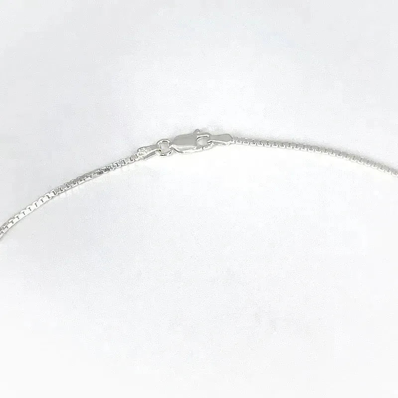 Sterling silver box chain is 18’’ long, lobster clasp.