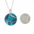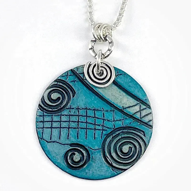 This modern aqua copper and sterling silver necklace includes a one-of-a-kind roll-printed design, hand-colored with layers and layers of Prismacolors, and sealed to maintain the vivid colors. A black patina brings out the hand-stamped textures in the sterling silver circle. Forged sterling spiral.