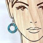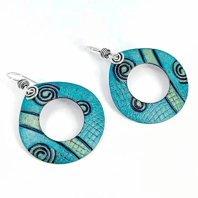 These lightweight aqua copper earrings with sterling silver accents are roll-printed to create a one-of-a-kind texture pattern, hand-colored with layers and layers of Prismacolors, and sealed to maintain the vivid colors. Original art for your ears!