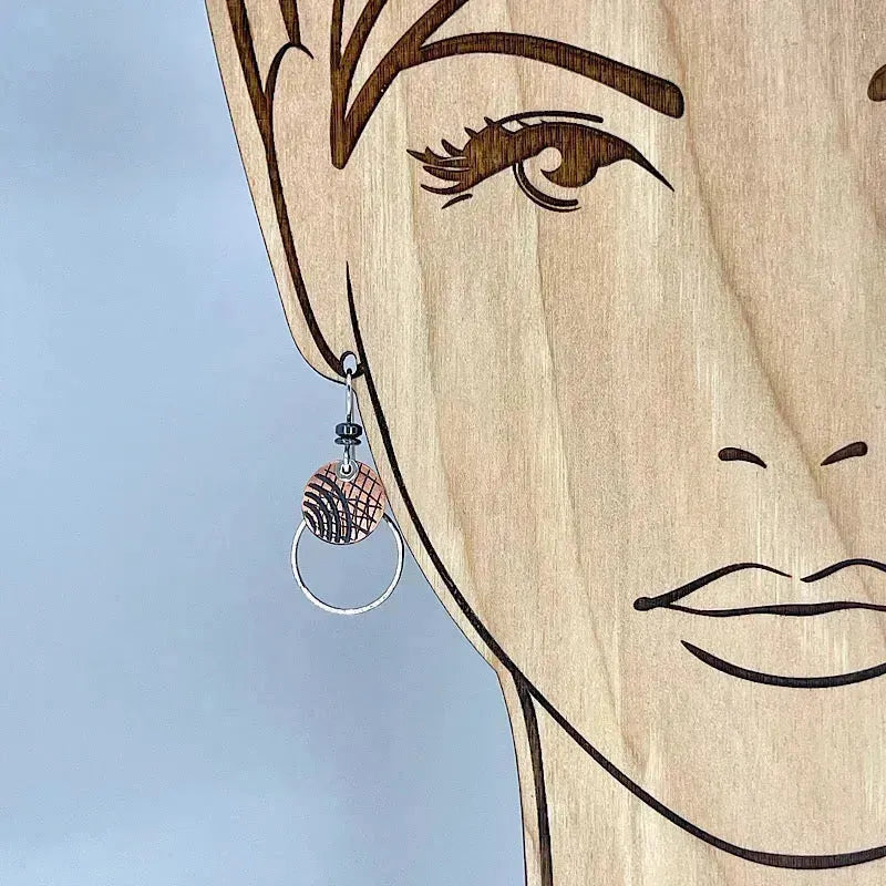 Every pair of our copper graphite patina and sterling earrings have a unique textural pattern from the next, there is only one of each. Each piece is sealed to maintain the true colors.