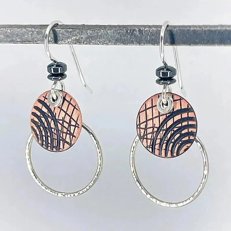 Copper graphite patina and sterling earrings. Includes hematite gems, sterling silver forged circles, hammered hoops, and sterling ear wires.