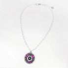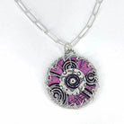 Add a pop of color with this one-of-a-kind pink copper and sterling silver necklace. This modern design includes roll-printed copper petals, hand-colored with layers and layers of Prismacolors, sealed to maintain the vivid colors. A black patina brings out the hand-stamped textures in the sterling silver center and circle backing. Flower layers are connected with sterling silver embroidery and center rivet.