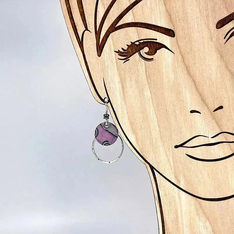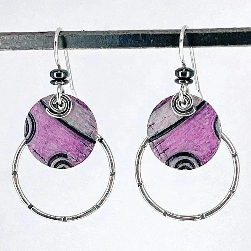 These lightweight pink copper earrings with sterling silver accents and hematite gems are roll-printed to create a one-of-a-kind texture pattern, hand-colored with layers and layers of Prismacolors, and sealed to maintain the vivid colors. Original art for your ears!