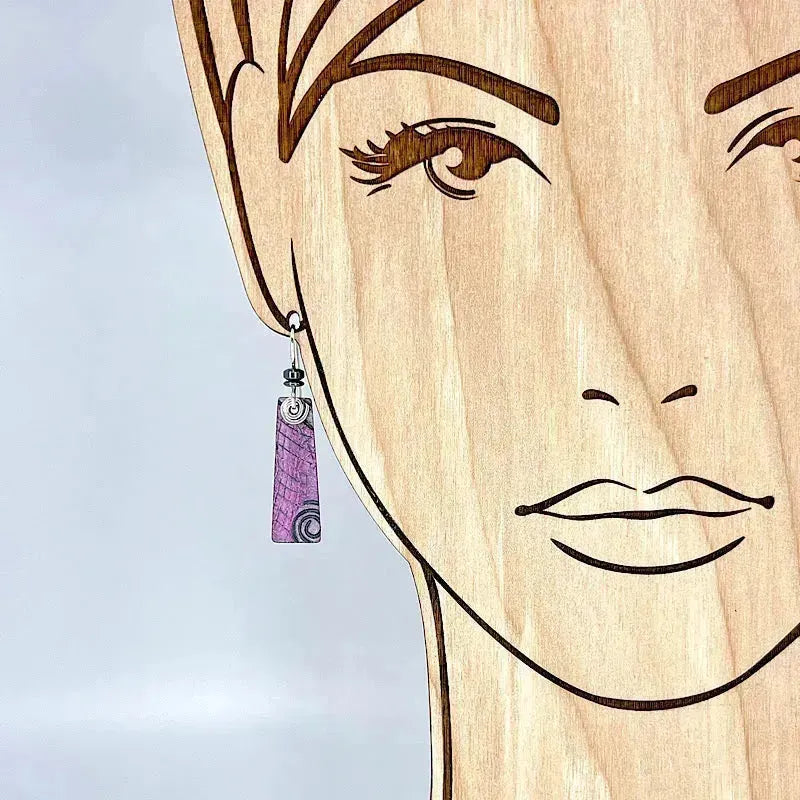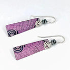 These lightweight pink copper earrings with sterling silver accents and hematite gems are roll-printed to create a one-of-a-kind texture pattern, hand-colored with layers and layers of Prismacolors, and sealed to maintain the vivid colors. Original art for your ears!