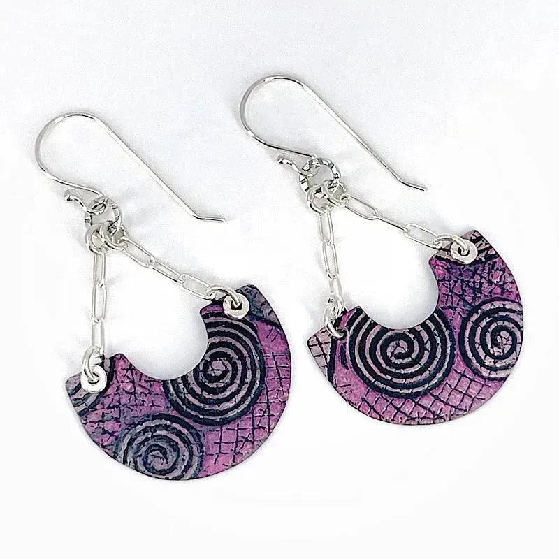 These lightweight pink copper earrings with sterling silver accents are roll-printed to create a one-of-a-kind texture pattern, hand-colored with layers and layers of Prismacolors, and sealed to maintain the vivid colors. Original art for your ears!