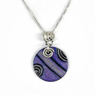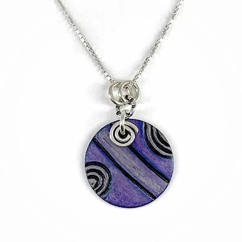 Add a pop of color & individuality with this purple copper and sterling silver necklace. Includes a one-of-a-kind roll-printed design, hand-colored with layers and layers of Prismacolors, and sealed to maintain the vivid colors. A black patina brings out the hand-stamped textures in the sterling silver circle. Forged sterling spiral.