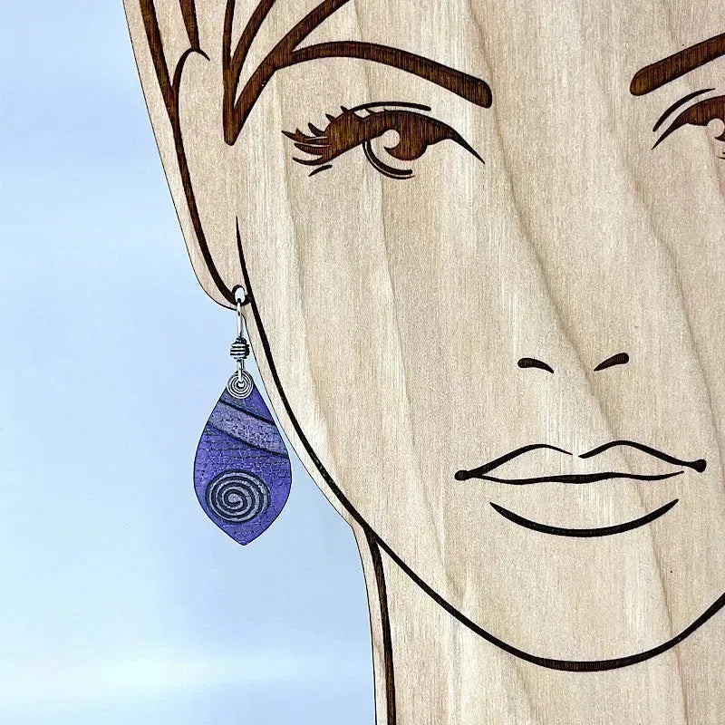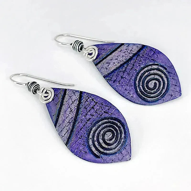 These lightweight purple copper earrings with sterling silver accents are roll-printed to create a one-of-a-kind texture pattern, hand-colored with layers and layers of Prismacolors, and sealed to maintain the vivid colors. Original art for your ears!