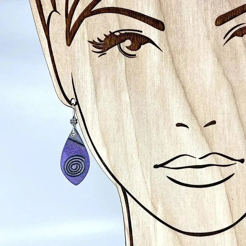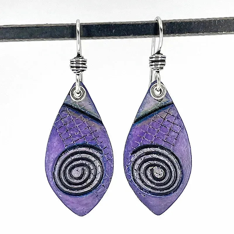 These lightweight purple copper earrings with sterling silver accents are roll-printed to create a one-of-a-kind texture pattern, hand-colored with layers and layers of Prismacolors, and sealed to maintain the vivid colors. Original art for your ears!