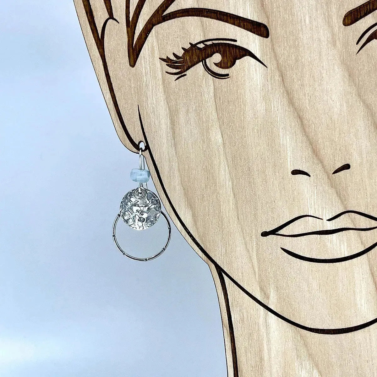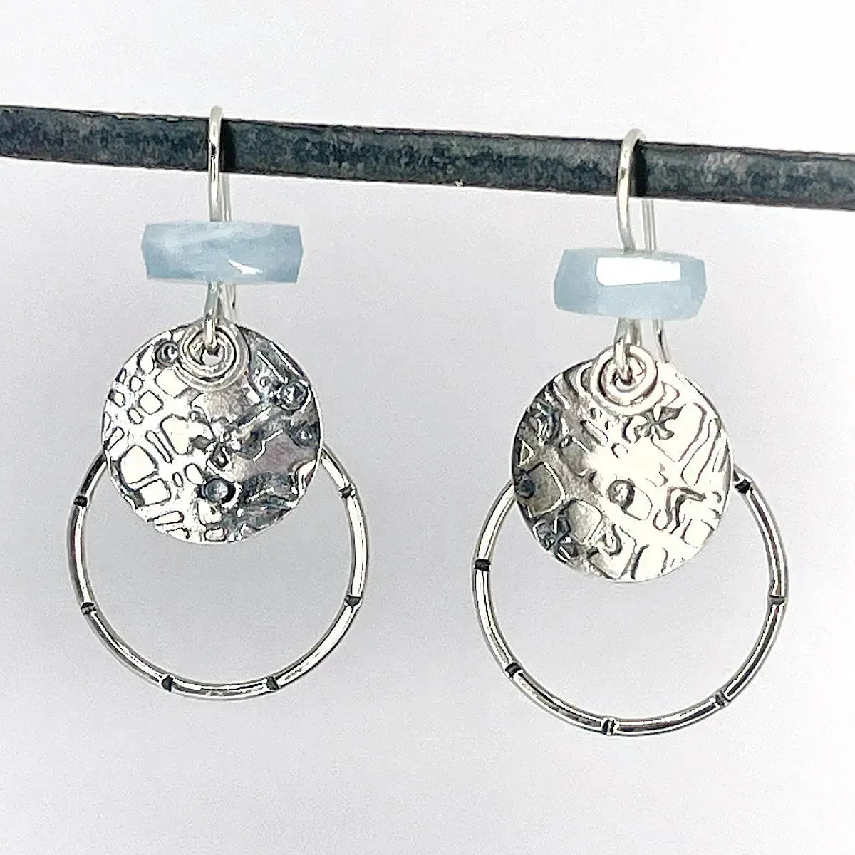 These sterling hoop earrings with aquamarine gems are a combo of nature + style. The shiny hand-stamped hoops swing independently, creating movement and play with the nature-inspired and hand-stamped circles. A black patina brings out the details.