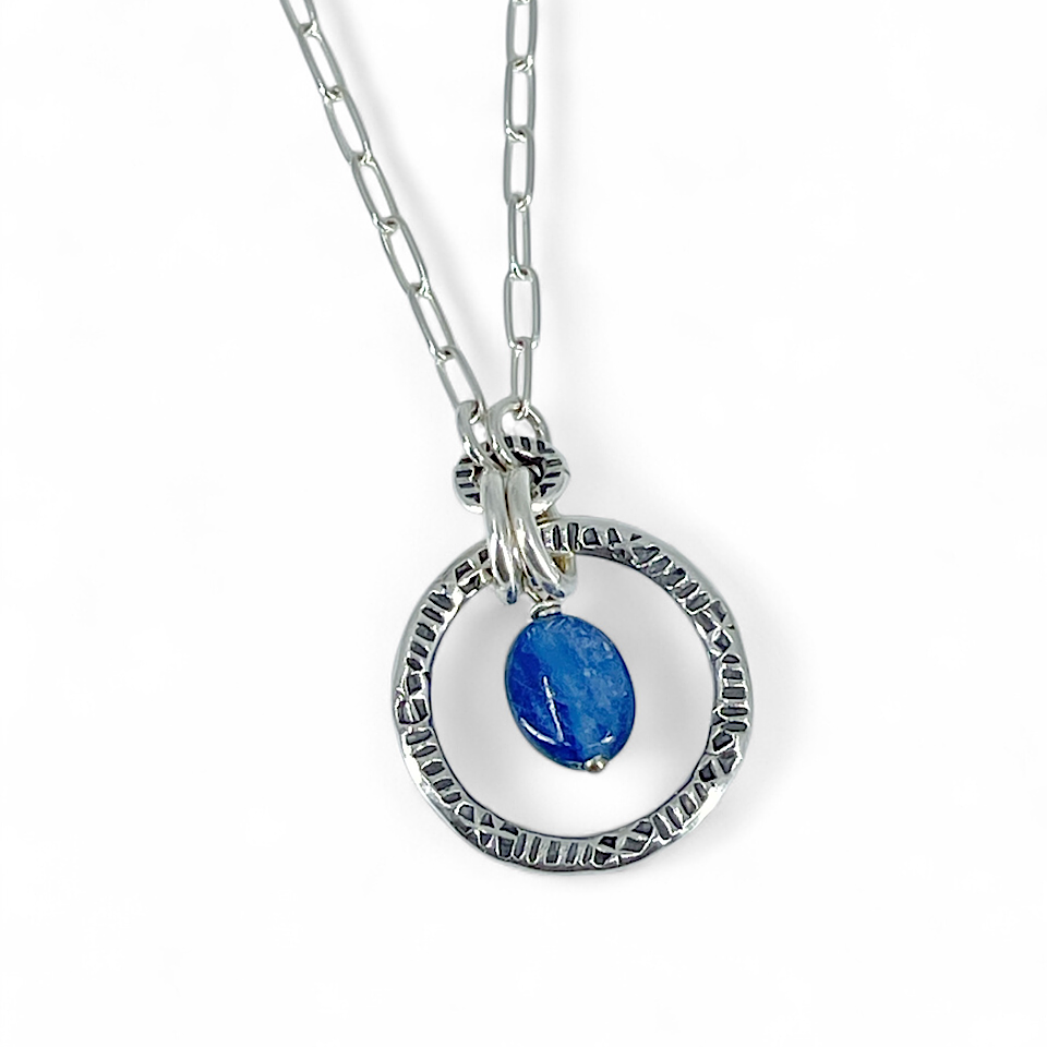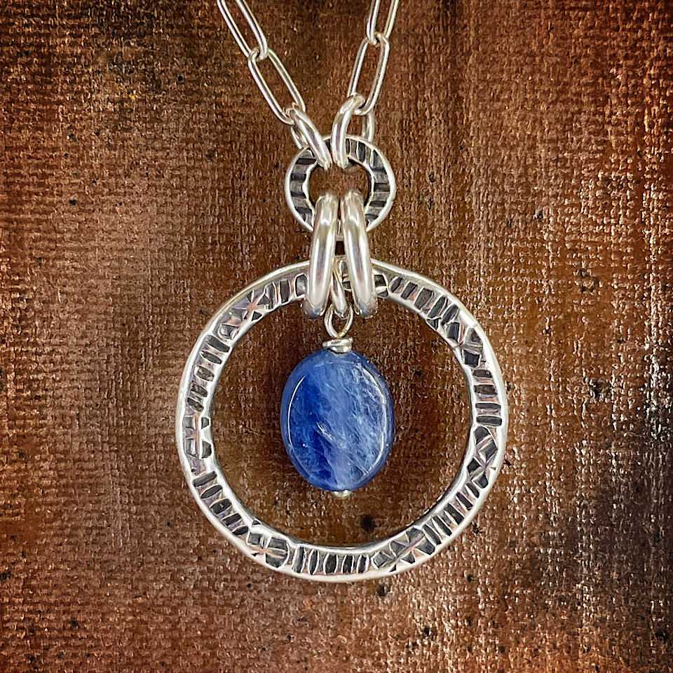 Hand-stamped sterling silver and kyanite necklace. Kyanite is said to be a balancing stone, enhancing communication, and fostering tranquility and mental clarity.