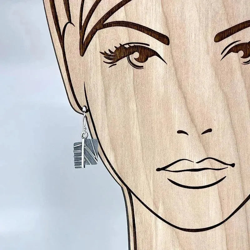 Add fun, style & individuality with art for your ears. Chris creates two designs, saws them apart, and arranges a striking, graphic, modern, one-of-a-kind design. All sterling — soldered, with a liver of sulfur patina. Prepare to receive lots of compliments!