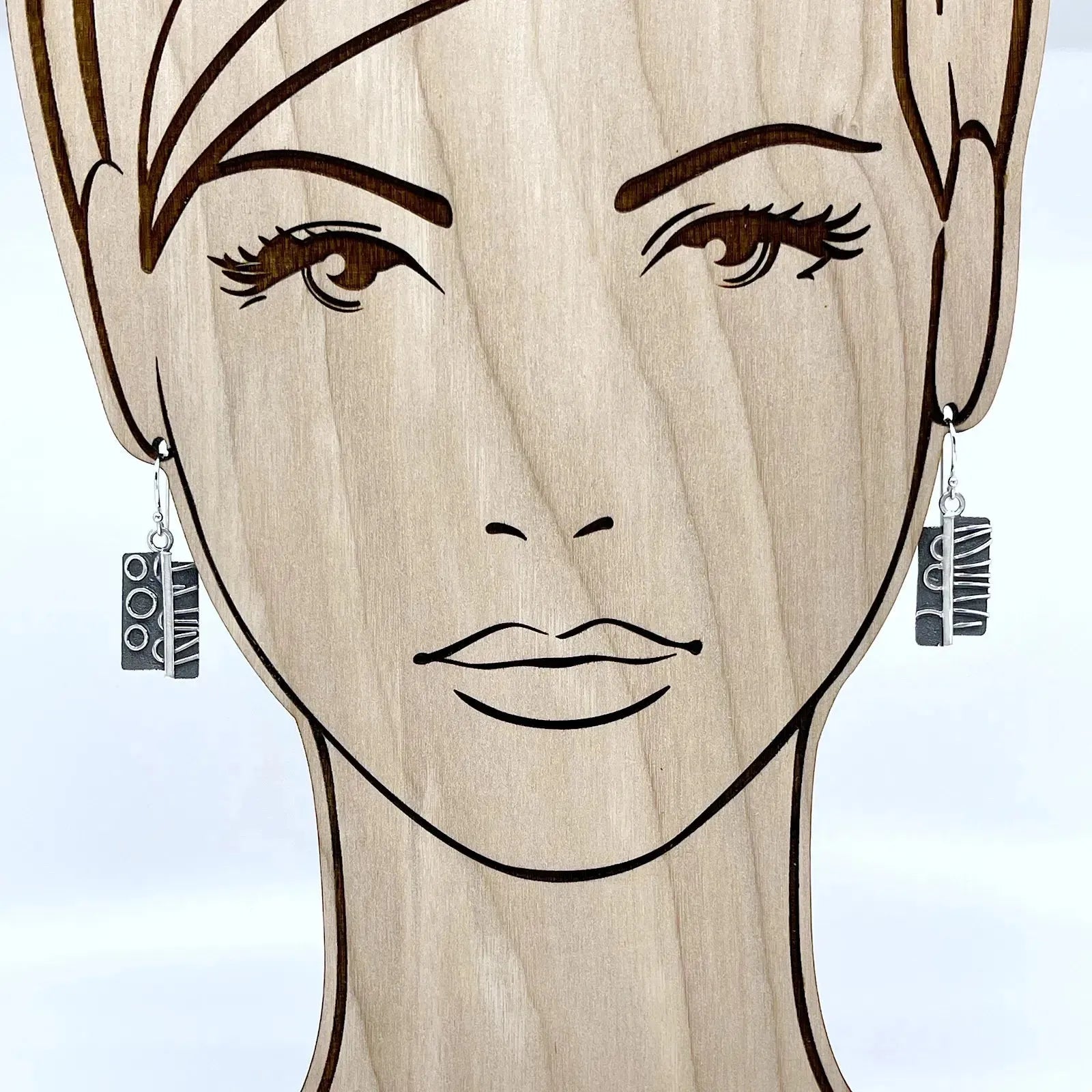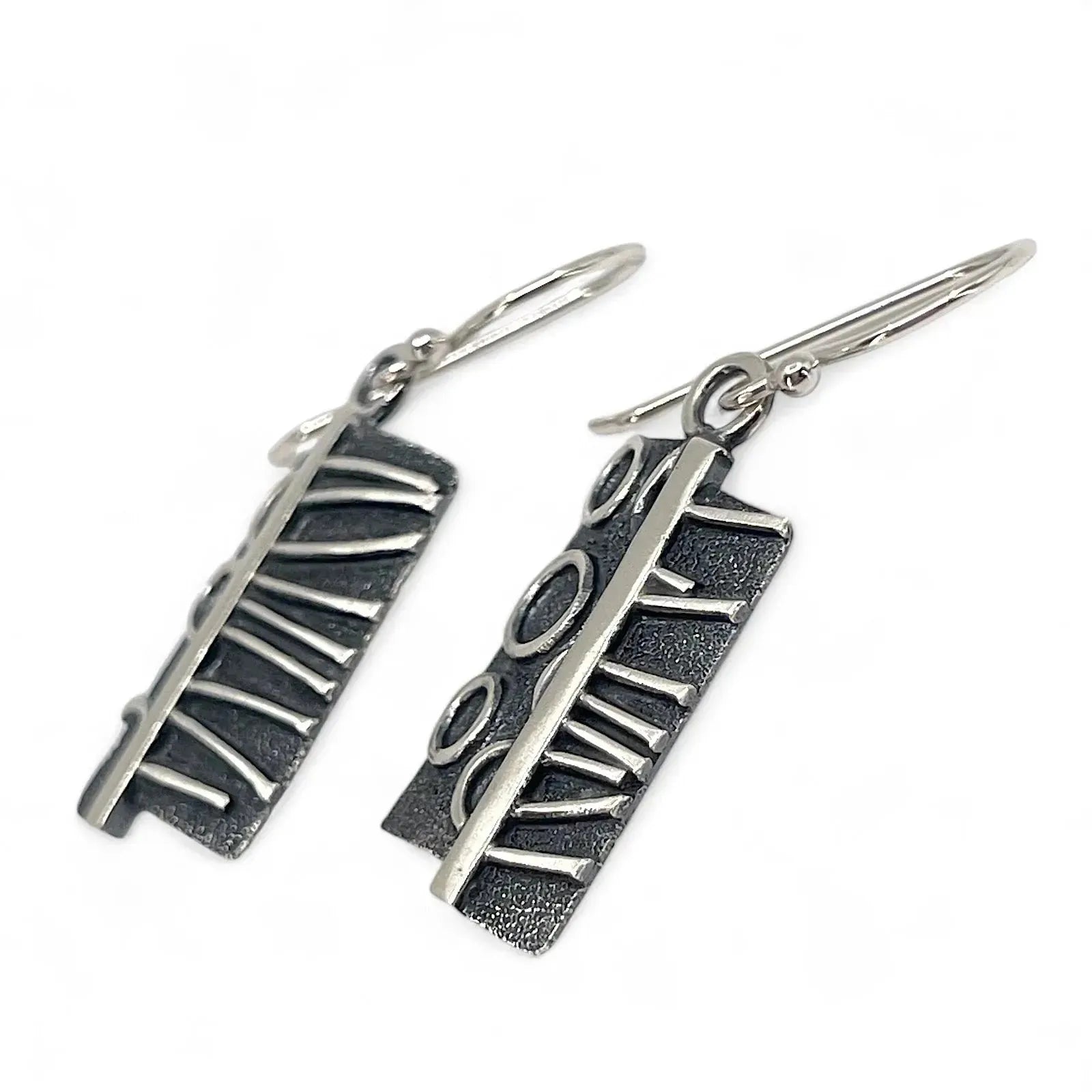 Add fun, style & individuality with art for your ears. Chris creates two designs, saws them apart, and arranges a striking, graphic, modern, one-of-a-kind design. All sterling — soldered, with a liver of sulfur patina.