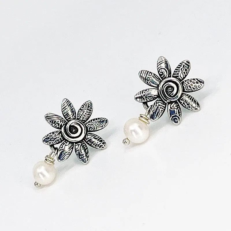 A subtle black patina brings out the delicate details of these sterling silver earrings with freshwater pearls. Shiny finish. Sterling silver posts and ear nuts.