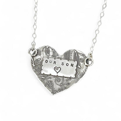 Custom order for Tarin & Emma! Two hearts holding “Junior” on the front with “our son” on the back with textures symbolizing their eternal energetic bonds of connection.
