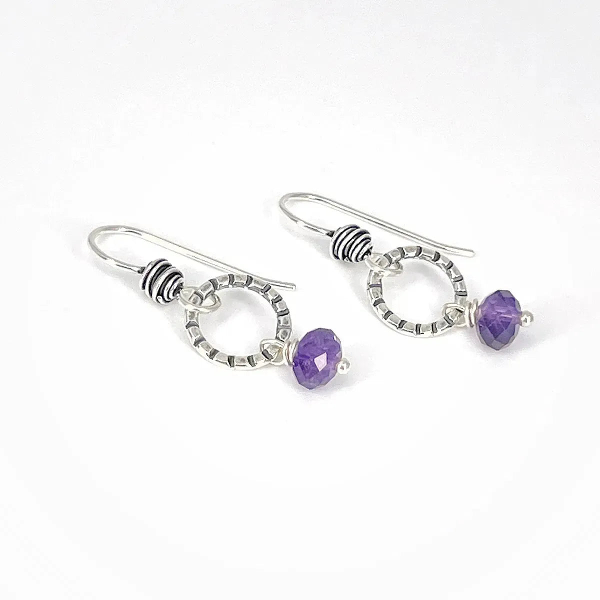 Our small sterling silver hoop earrings with amethyst. These faceted rondelle amethyst gems are said to be a natural stress reliever, bringing peace, inner strength, intuition and wisdom.