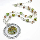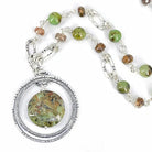 The pendant features stunning rainforest rhyolite jasper, renowned for its ability to deepen your connection with nature, promote balance and well-being, spark creativity, and foster a positive outlook on life. Let this captivating gemstone inspire you daily.