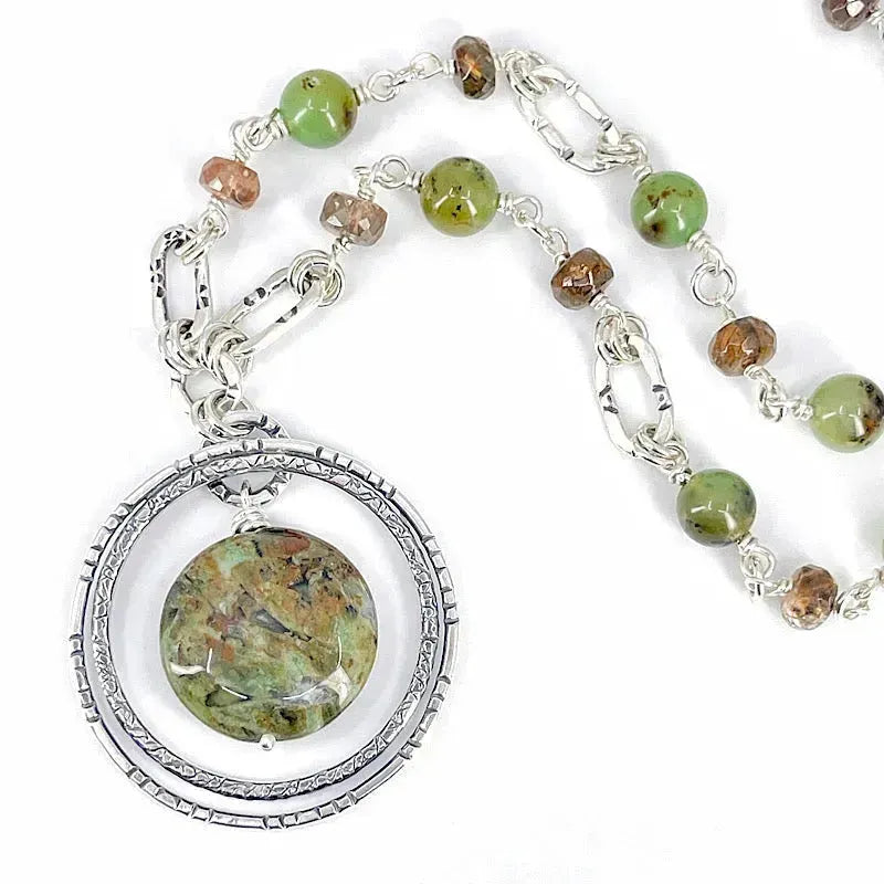 Sterling Silver Necklace with Rhyolite, Jade, and Brown Sunstone by Kristin Christopher