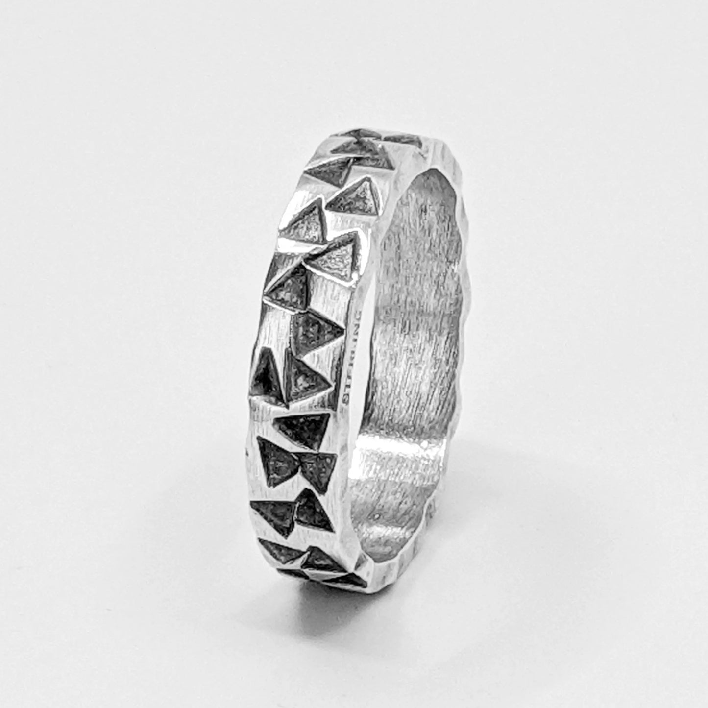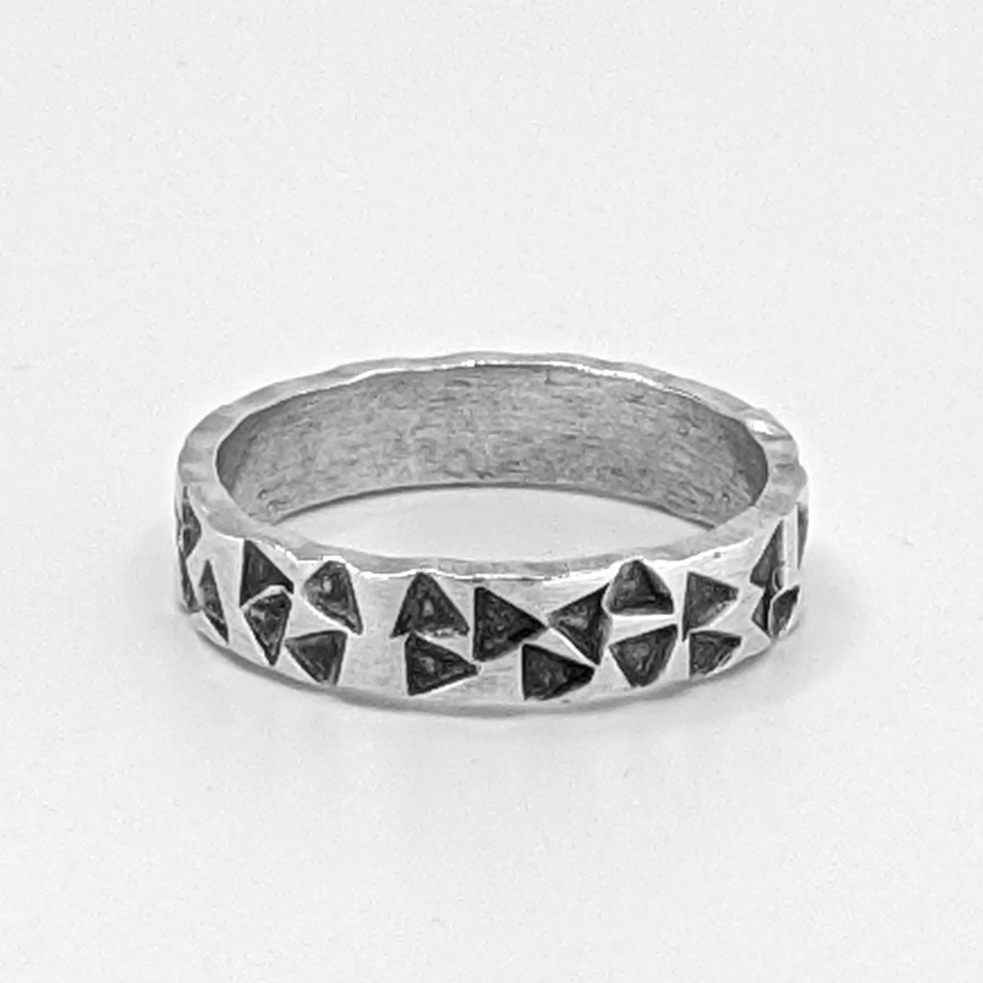 This sterling silver ring is hand-fabricated and each triangular mark is hand-stamped into the surface of the ring. A black patina brings out the details against the bright satin finish. Each ring we create with this pattern develops its own unique character, as every mark is placed by hand.