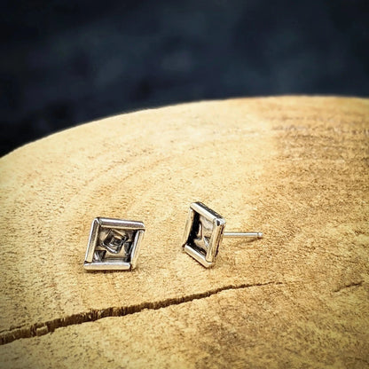 Hand-stamped sterling silver post earrings with black patina. Shiny finish. Sterling silver posts and ear nuts.